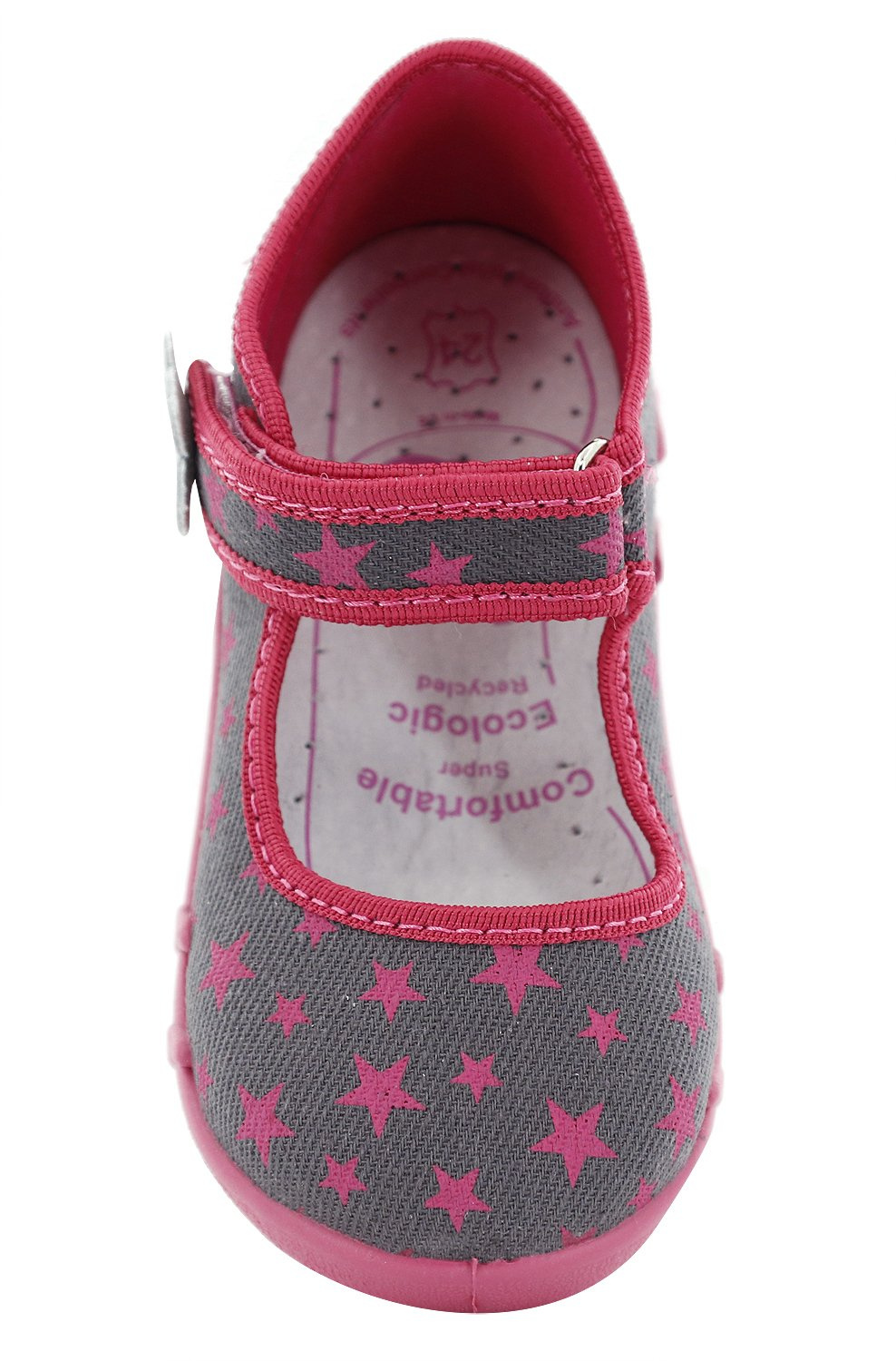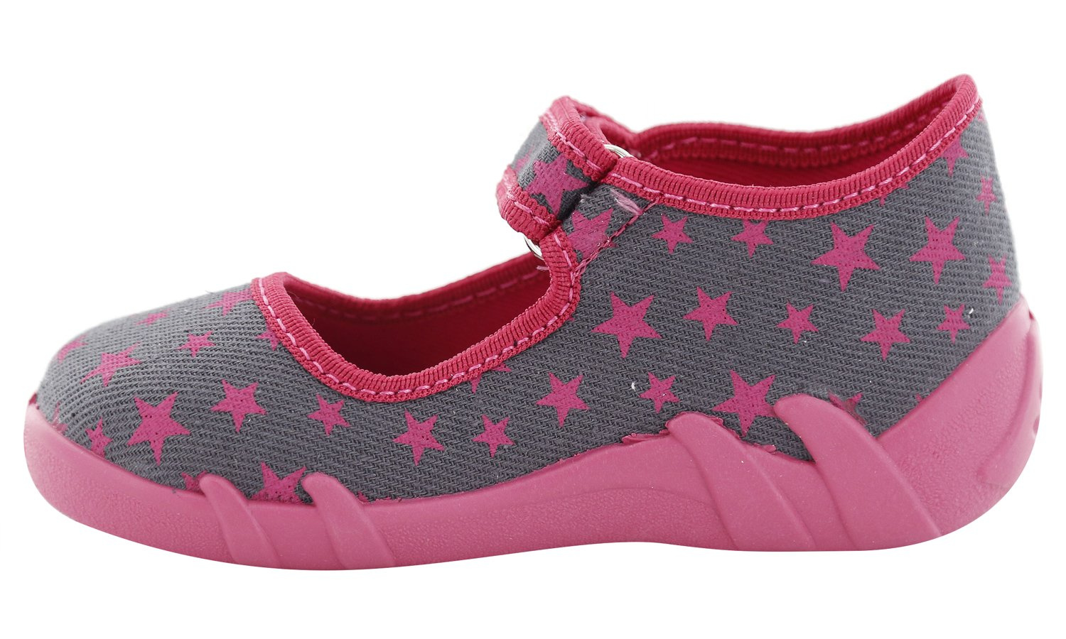 RENBUT sklep - kapcie dziecięce obuwie tekstylne, przedszkolne, profilaktyczne wykonane z naturalnej bawełny. Wkładka wewnętrzna profilowana, antybakteryjna wykonana z naturalnej skóry i pianki lateksowej zawierającej aktywny węgiel drzewny absorbujący pot i zapachy. Podeszwa profilowana, oddychająca (system wentylacji) wykonana z elastycznego i lekkiego tworzywa PVC doskonale przenosi obciążenia na podłoże i amortyzuje wstrząsy. Usztywniona cholewka stabilizuje stopę. Regulowane zapięcie na rzepy pozwala precyzyjnie dopasować obuwie do różnych kształtów stopy. Obuwie pod względem konstrukcyjnym, technologicznym i materiałowym spełnia wymogi certyfikatu "Zdrowa Stopa" przyznawanego przez IPS w Krakowie i zostało wyróżnione przez specjalistów znakiem "Żółtej Stopy" jako idealne w profilaktyce kształtowania prawidłowego rozwoju, funkcjonowania i budowy stopy dziecka.