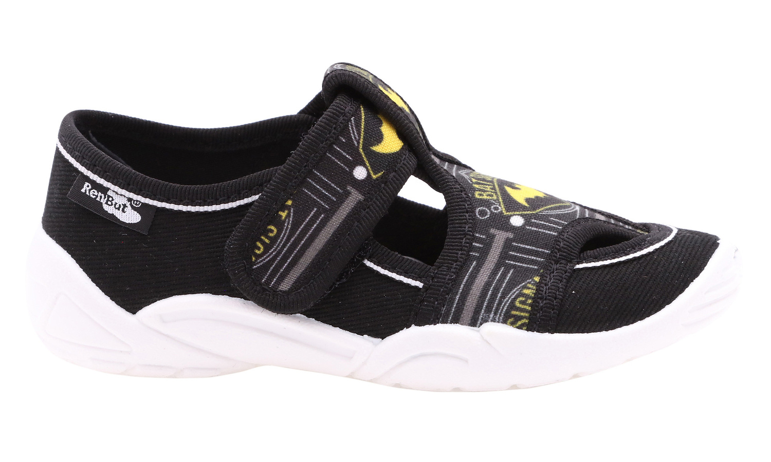 RENBUT sklep - Kapcie dziecięce obuwie tekstylne, przedszkolne, profilaktyczne wykonane z naturalnej bawełny. Wkładka wewnętrzna profilowana, antybakteryjna wykonana z naturalnej skóry i pianki lateksowej zawierającej aktywny węgiel drzewny absorbujący pot i zapachy. Podeszwa profilowana, oddychająca (system wentylacji) wykonana z elastycznego i lekkiego tworzywa PVC doskonale przenosi obciążenia na podłoże i amortyzuje wstrząsy. Usztywniona cholewka stabilizuje stopę. Regulowane zapięcie na rzepy pozwala precyzyjnie dopasować obuwie do różnych kształtów stopy. Obuwie pod względem konstrukcyjnym, technologicznym i materiałowym spełnia wymogi certyfikatu "Zdrowa Stopa" przyznawanego przez IPS w Krakowie i zostało wyróżnione przez specjalistów znakiem "Żółtej Stopy" jako idealne w profilaktyce kształtowania prawidłowego rozwoju, funkcjonowania i budowy stopy dziecka.