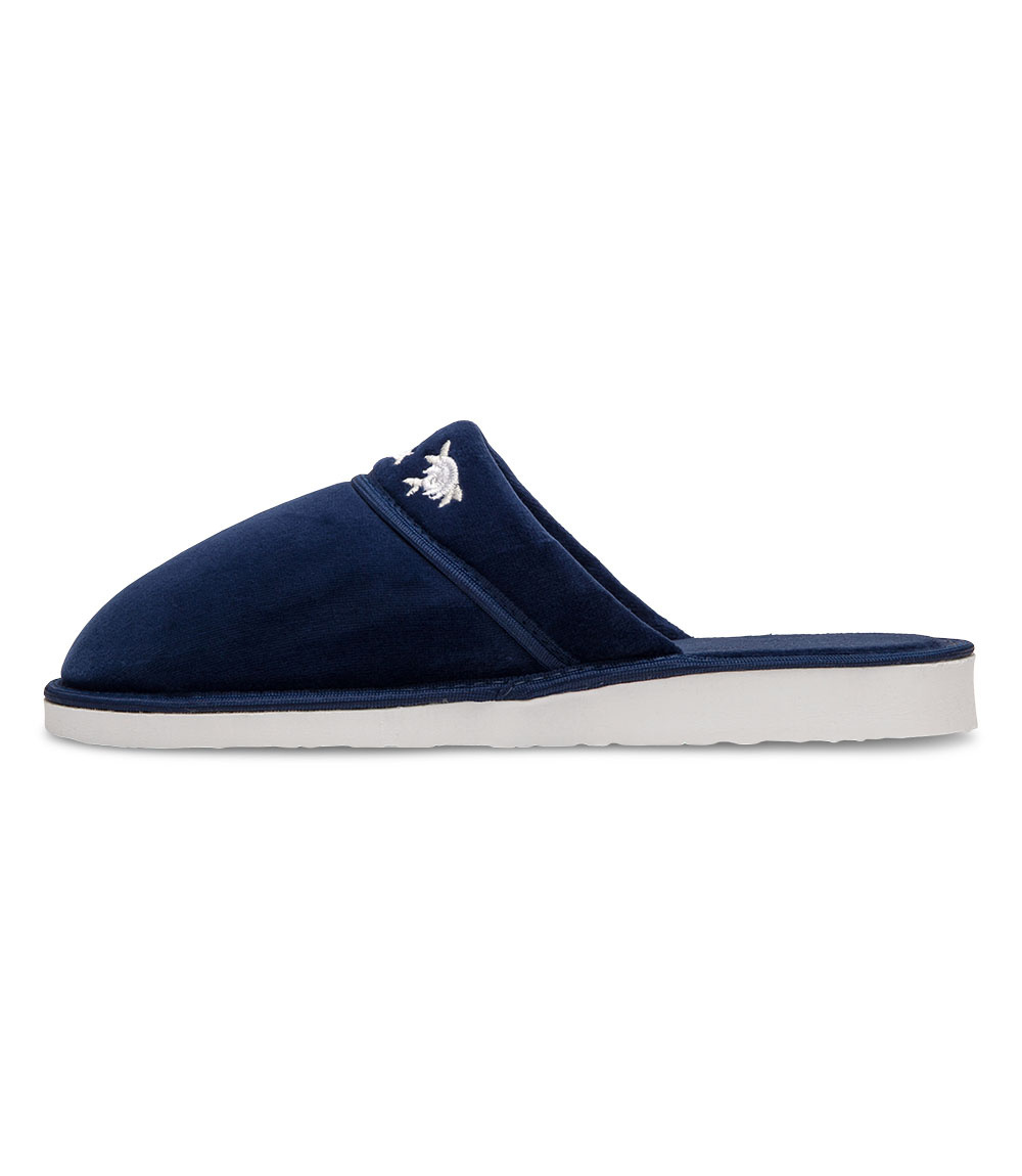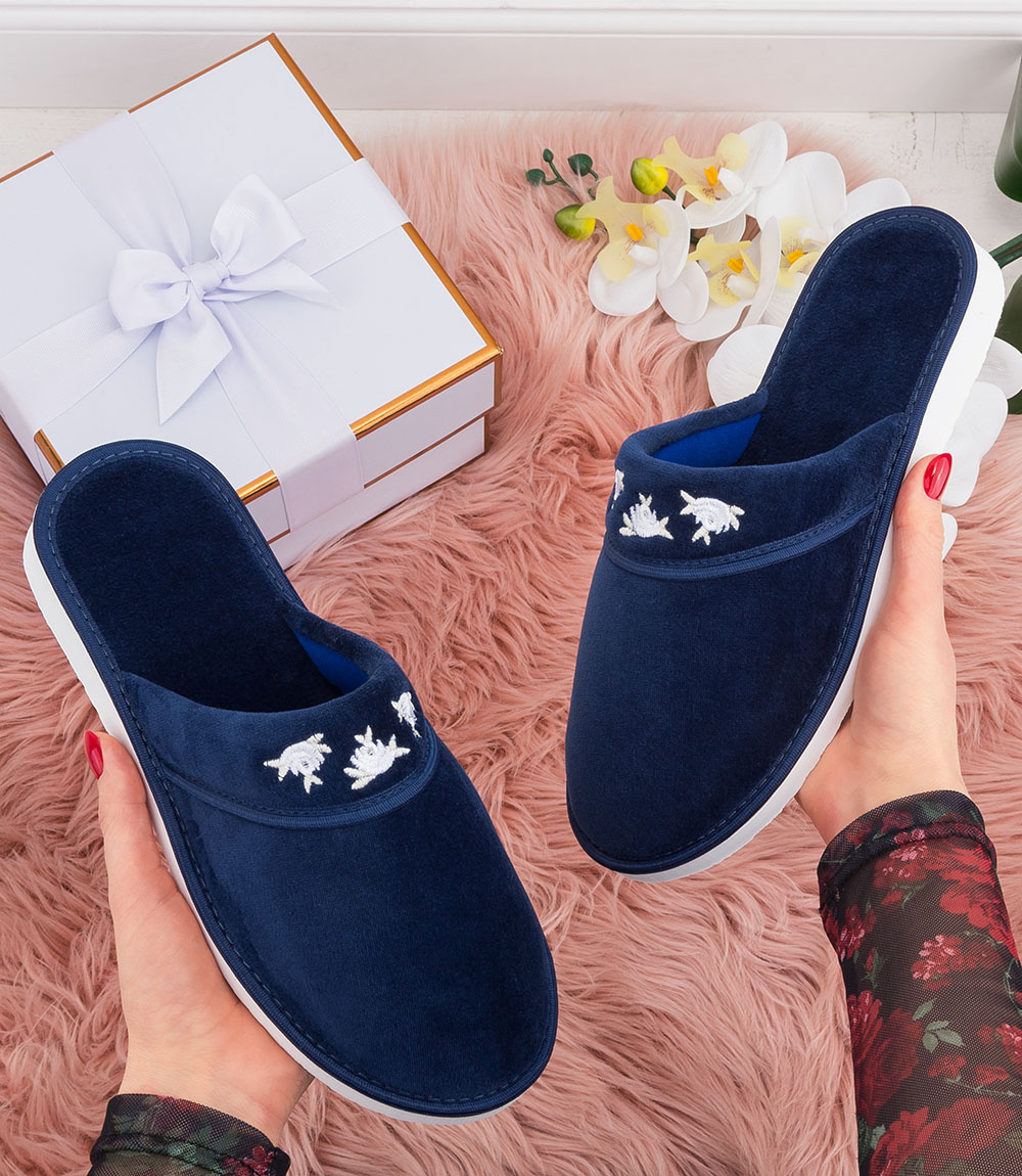 Postaw na komfort i elegancję w domowym wydaniu z kapciami Natural Style. Wykonane z miękkiego weluru w głębokim odcieniu granatu, zachwycają subtelnym haftem w białym kolorze, który nadaje im wyjątkowego charakteru.