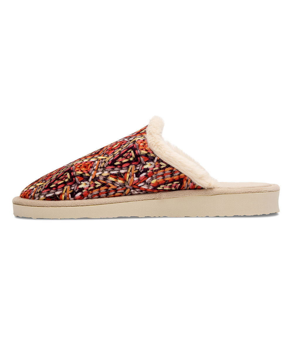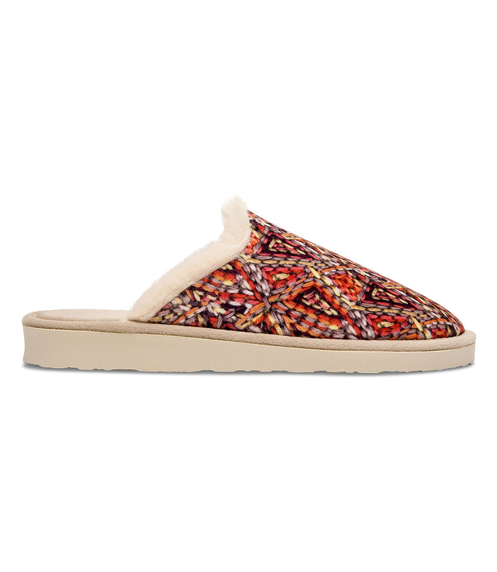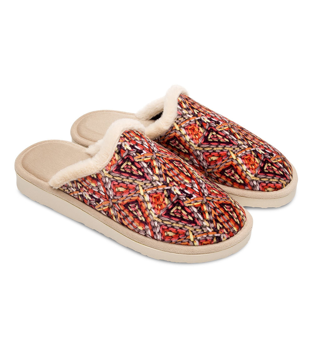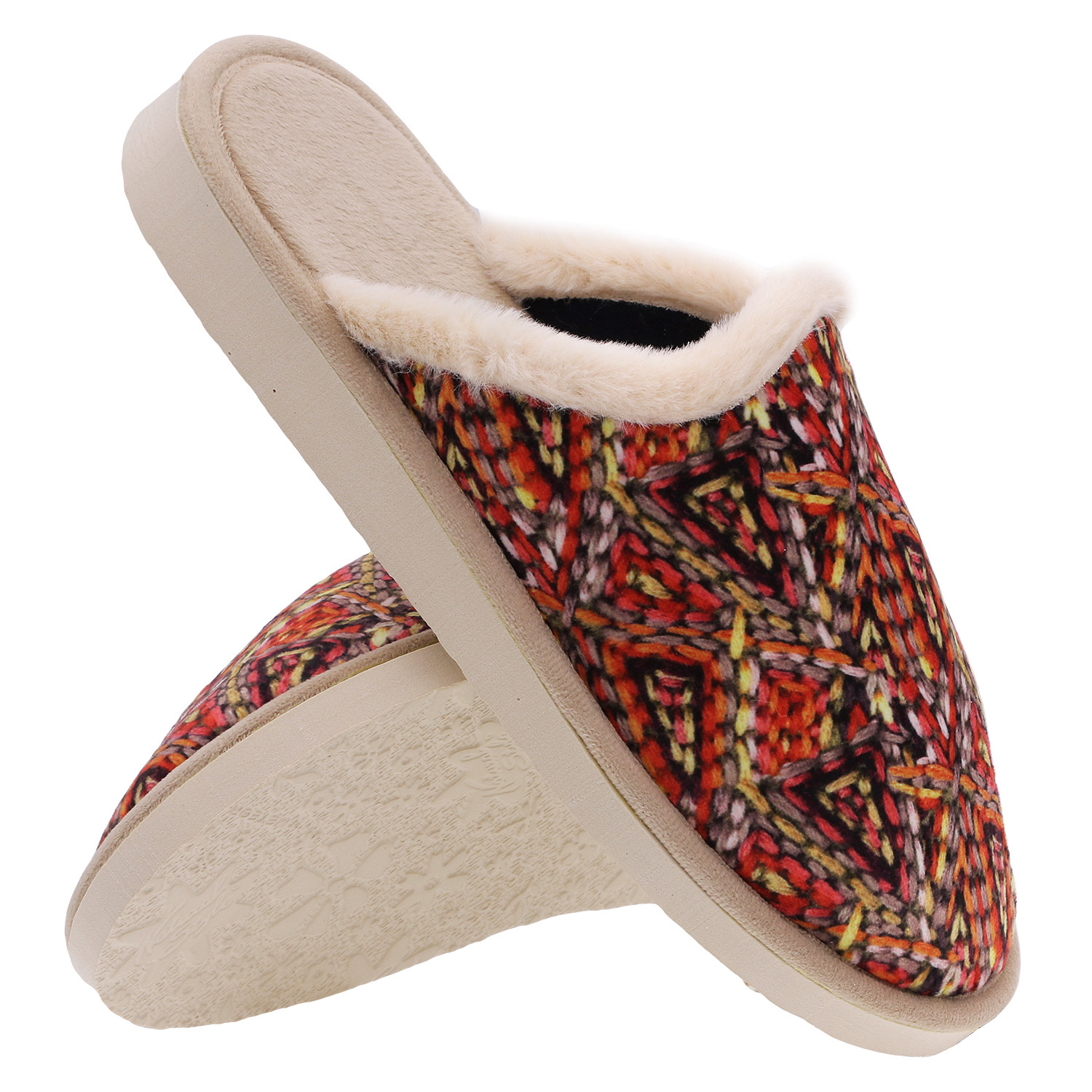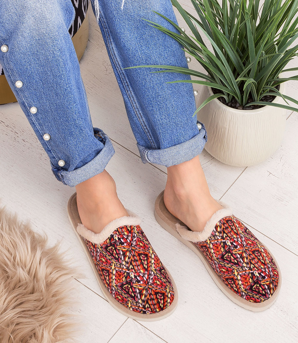 Kapcie Natural Style to idealne połączenie tradycyjnego stylu i domowego komfortu. Wierzch wykonany został z miękkiej dzianiny o geometrycznym wzorze w odcieniach czerwieni, pomarańczu, żółci, bieli i czerni, co nadaje im wyjątkowego, przyciągającego uwagę charakteru. Wnętrze oraz wykończenie otworu obszyte są kremowym, puszystym futerkiem, które zapewnia ciepło i wygodę w chłodniejsze dni.
