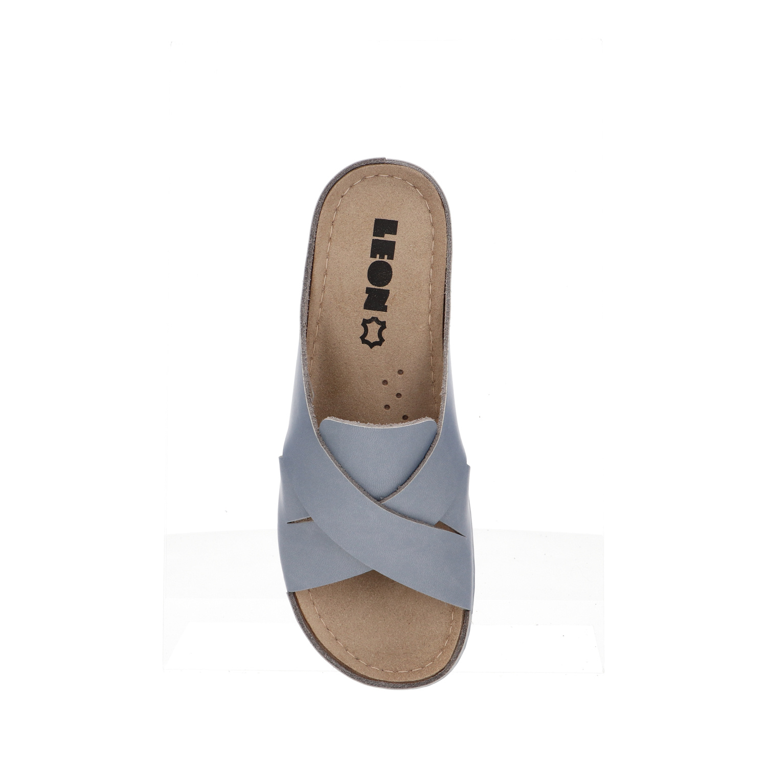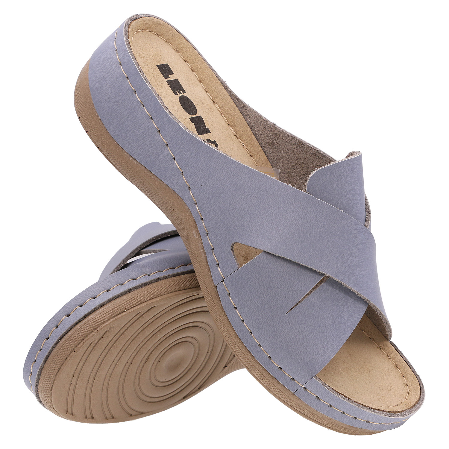 Damskie, skórzane, antypoślizgowe klapki Leon 932 z anatomicznie wyprofilowaną żelową wkładką, której górna część pokryta jest miękką skórą. Żelowa wkładka amortyzuje wstrząsy podczas chodzenia i pomaga w prawidłowym rozłożeniu ciężaru na stopie. Cholewka w całości wykonana jest z wysokiej jakości naturalnej skóry bydlęcej. Buty o nowoczesnym designie sprawdzą się zarówno w czasie wolnym, jak i w pracy. Są lekkie i bardzo wygodne. Za świetną cenę otrzymasz niezwykle wygodne i wysokiej jakości buty, które chronią kręgosłup przy każdym kroku.